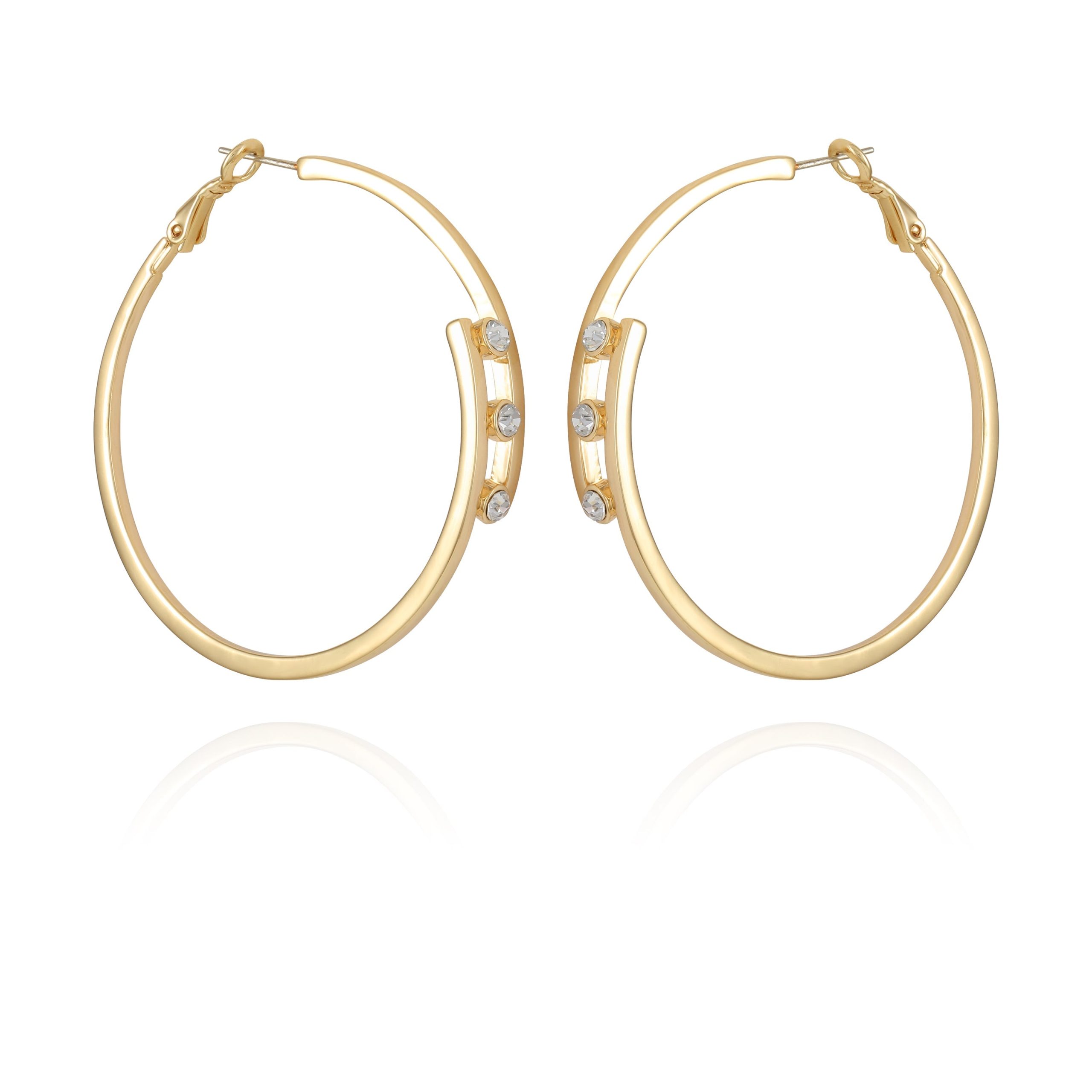 A trio of bezel set stones set in gold-plated metal. these bypass hoop earrings from Vince Camuto add a touch of glamour to any look.