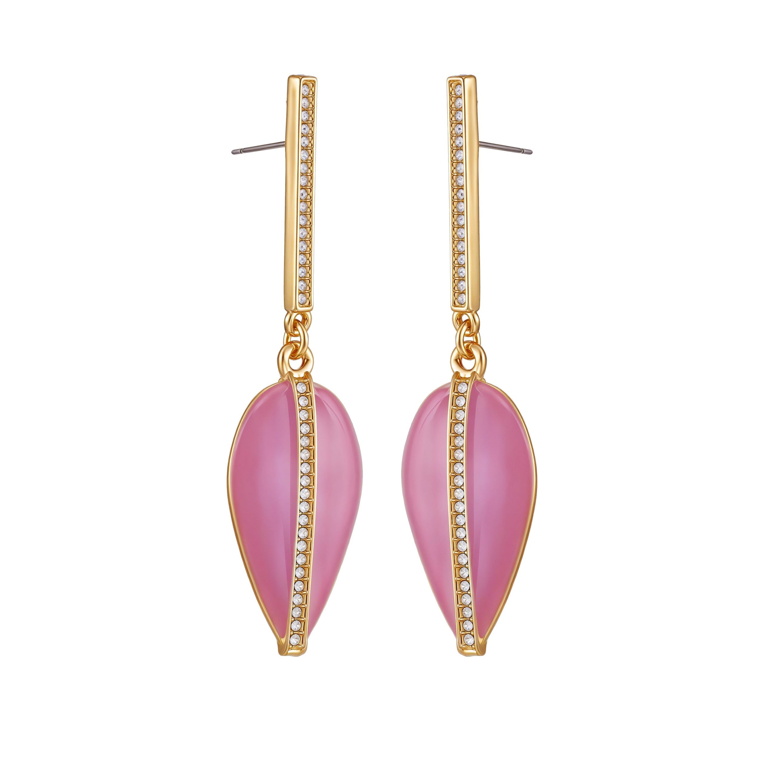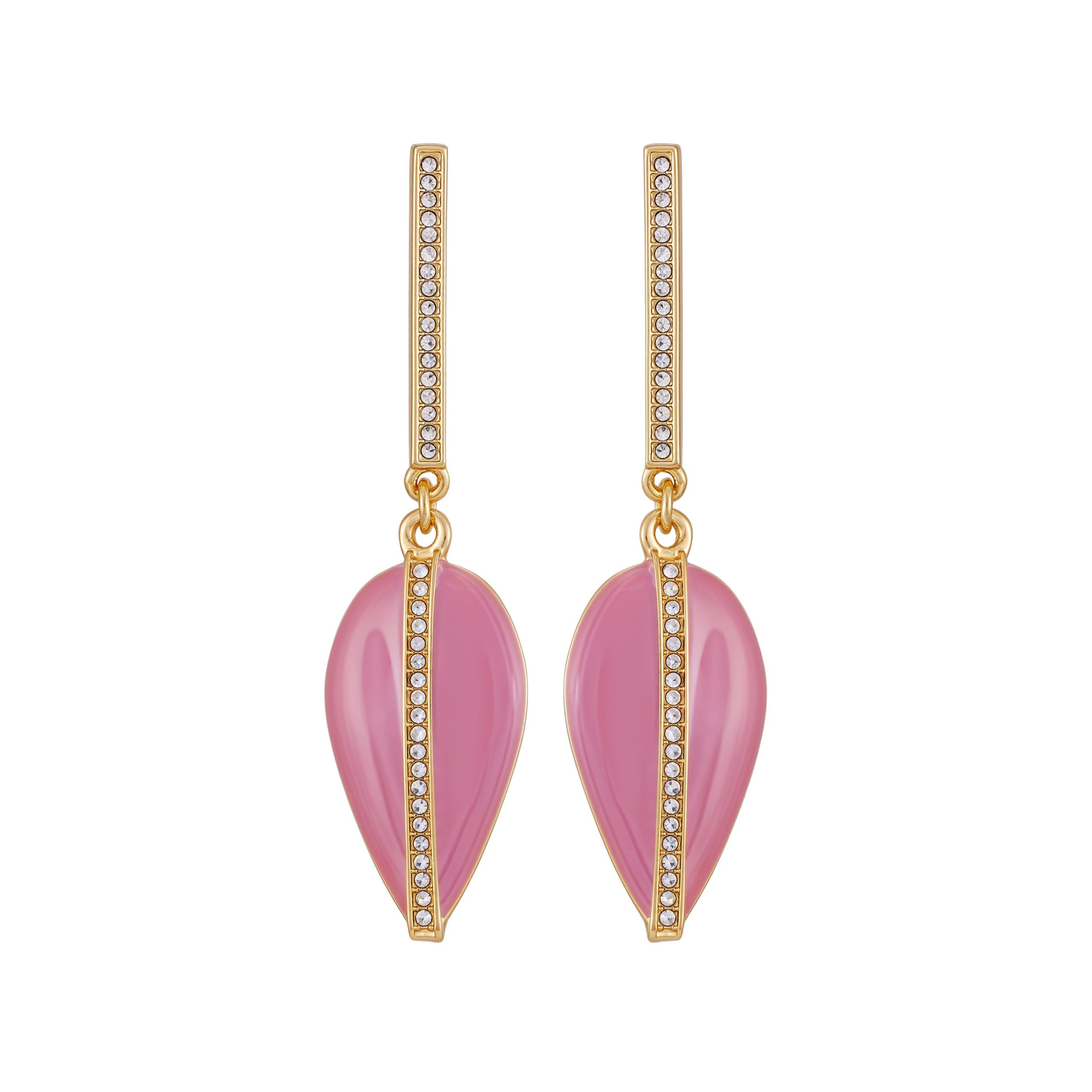 These stylish Vince Camuto drop earrings feature a gold-tone bar with a channel of sparkling glass stones. which leads to a vibrant pink enamel teardrop pendant. A thin line of gold and more glass stones separates the teardrop’s two pink sides. With a secure post and backing closure. these earrings have an approximate drop length of 2.3 (58mm). making them a fun statement piece.