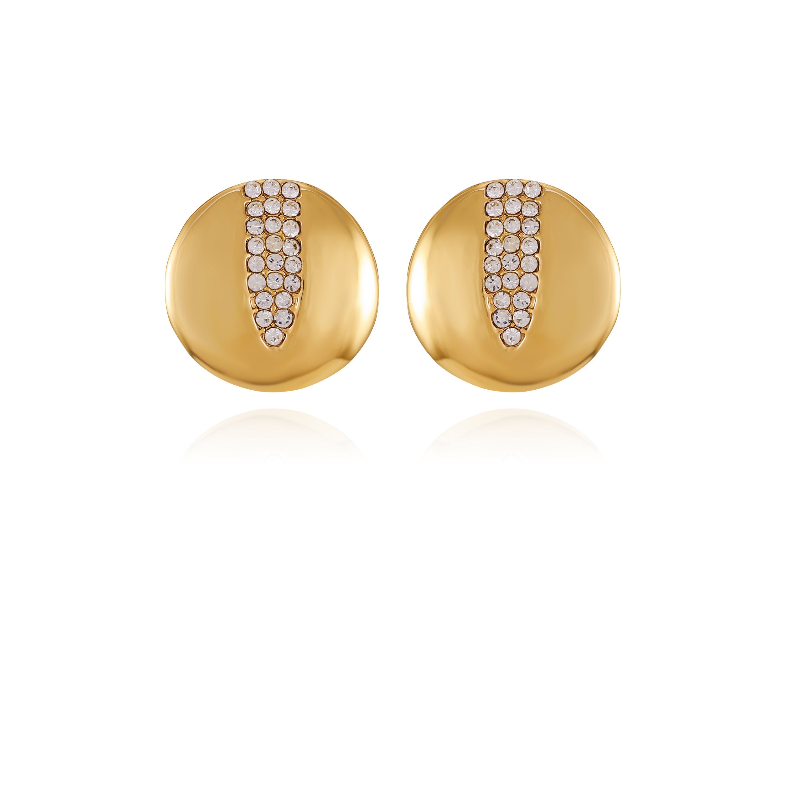 Featuring a classic coin design accented with sparkling crystal stones. Finished in polished goldtone with a secure post closure. these button earrings offer a timeless elegance and a touch of glamour. perfect for both casual and formal occasions.